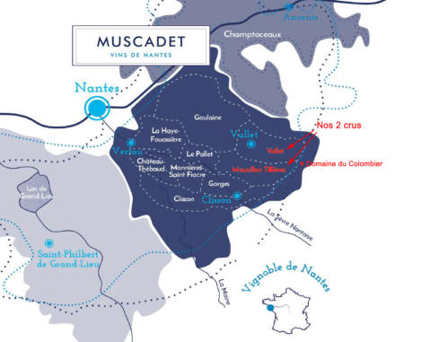 Les Muscadet Le nom «Muscadet» apparaît pour le première fois en 1635. Le melon de bourgogne, cépage originaire de la région éponyme, apparaît au XVIe siècle. Les vins du muscadet sont les seuls au monde à être issus de ce cépage. Ce sont des vins qui, notamment grâce à leur technique de vinification sur lie, leur élevage plus ou moins prolongé et la diversité de leur terroir, permet d’offrir une palette d’arômes très nuancés. Ces caractéristiques agissent sur la structure du vin et son épanouissement au nez et en bouche. Implanté au sud de l’agglomération Nantaise, le vignoble produit des vins frais, gouleyants qui portent les noms de : Muscadet et Gros Plant. Tillières se trouve à l’est, dans l’aire d’Appellation Muscadet Sèvre et Maine, ainsi que dans celle des crus Mouzillon- Tillières et Vallet.